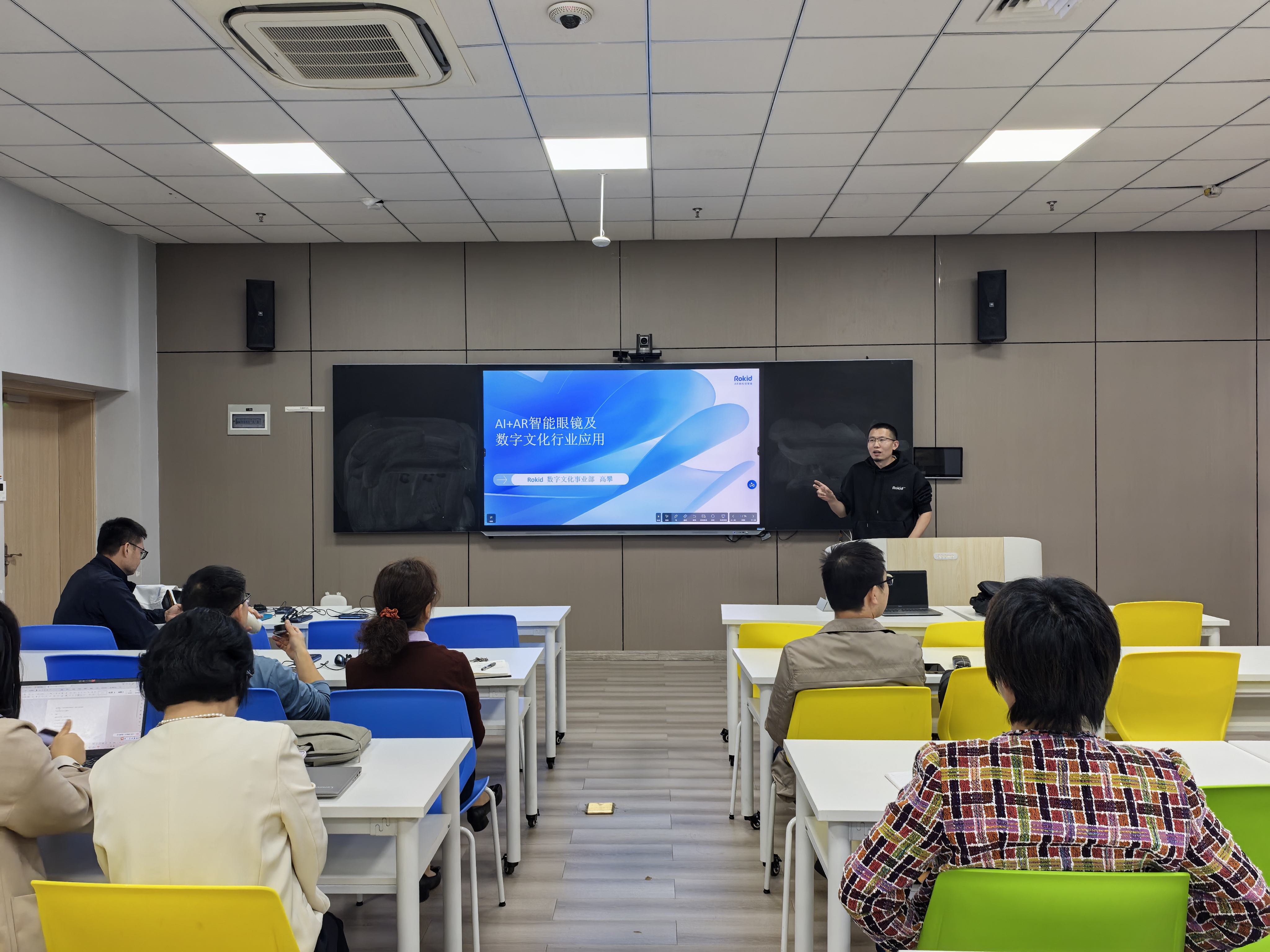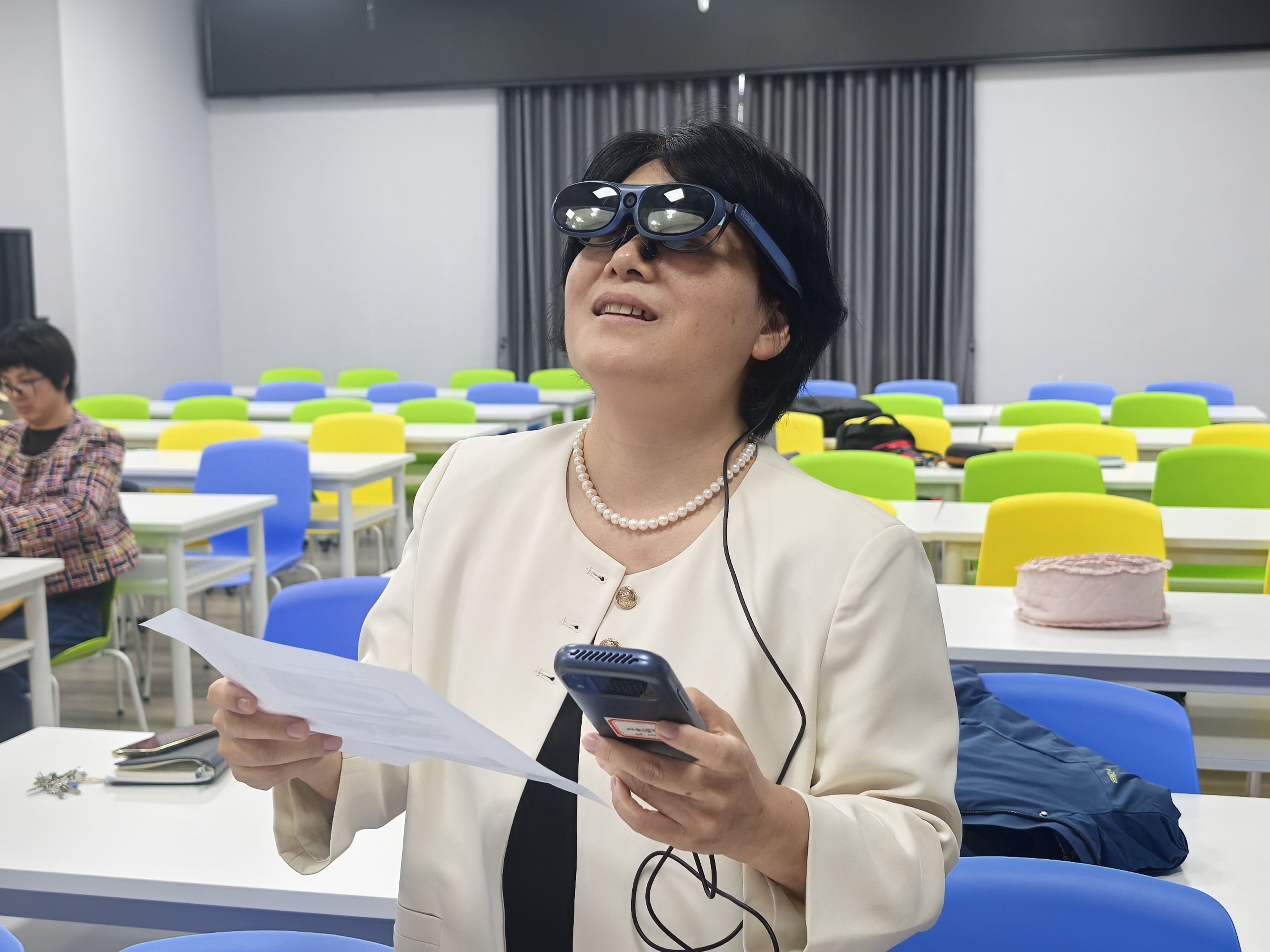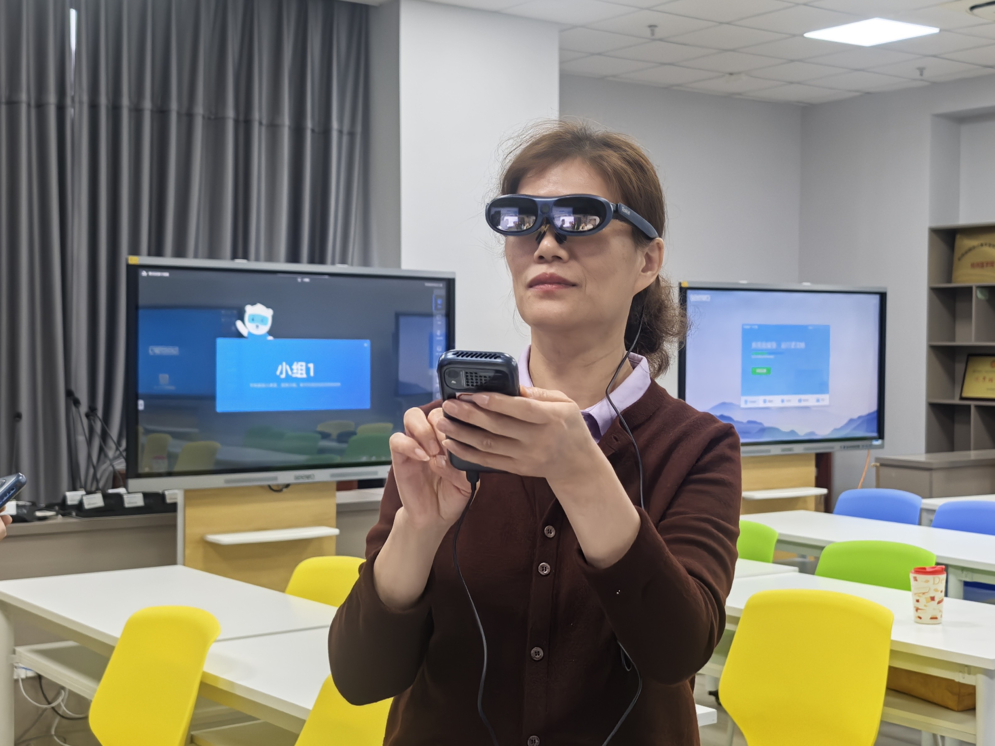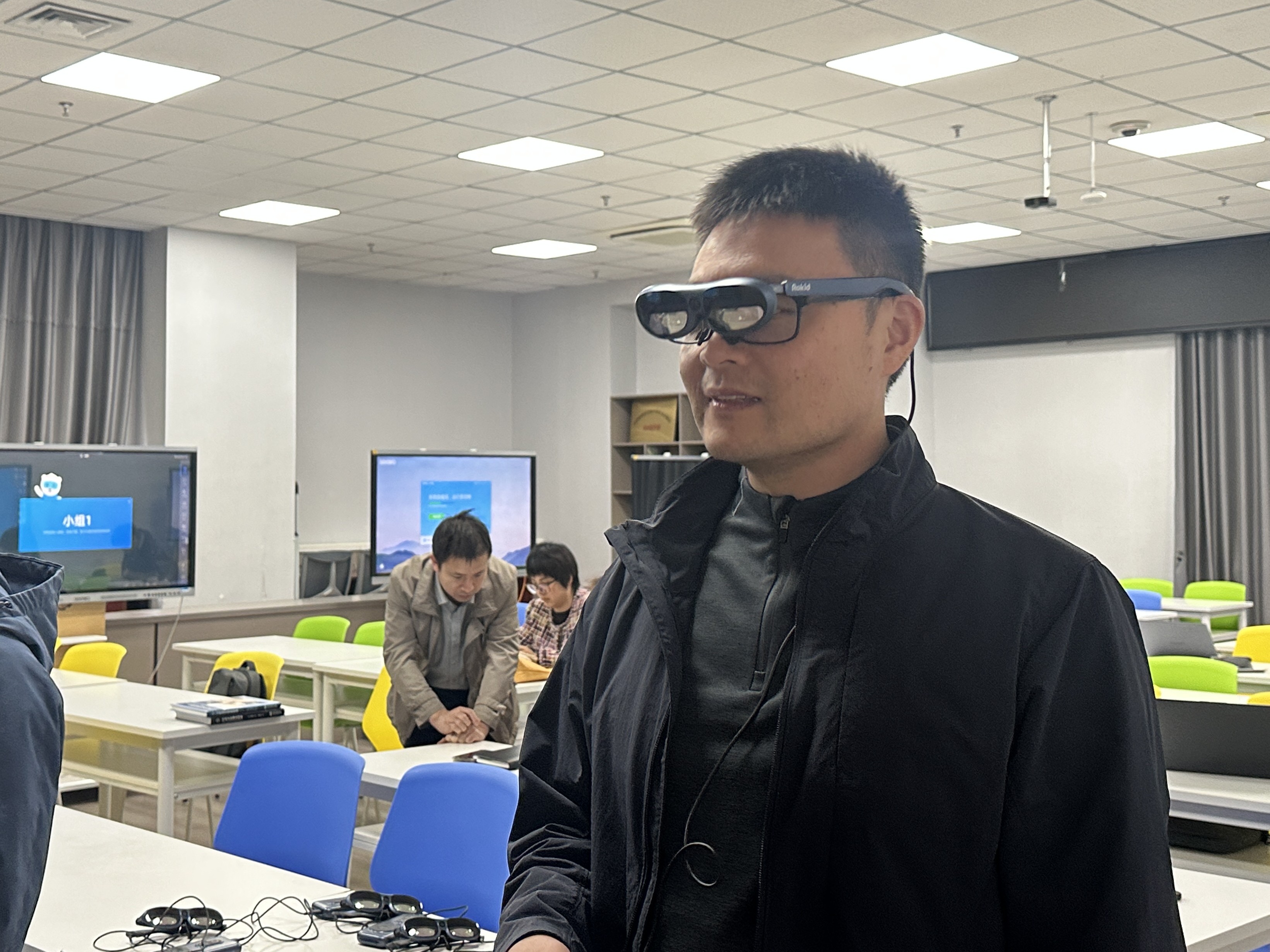 参训教师在中心技术人员的指导下,体验了Rokid Glass3企业级AR眼镜等前沿设备。
